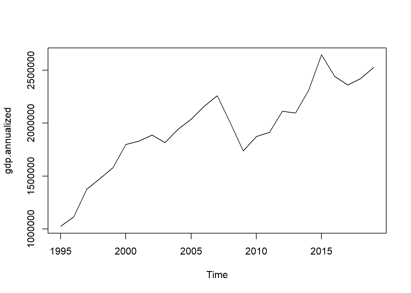 gdp.a <- ts(gdp.a$values, start = c(1995,1), end = c(2019, 1), frequency = 1)