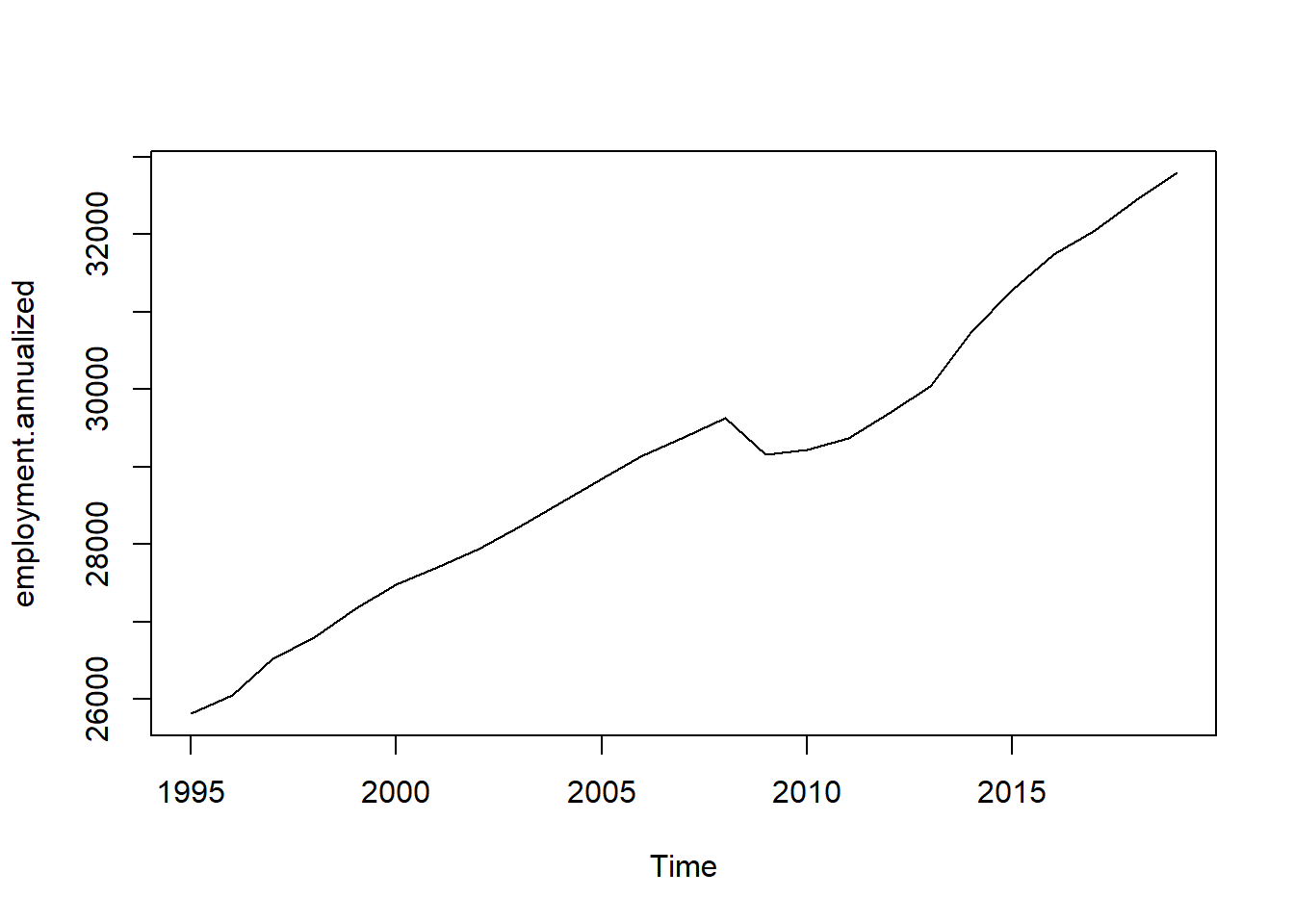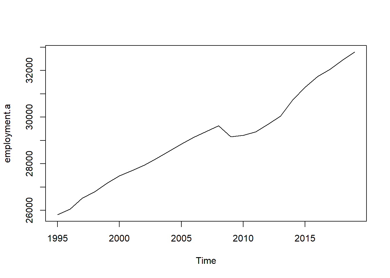 employment.a <- ts(employment.a$values, start = c(1995,1), end = c(2019, 1), frequency = 1)