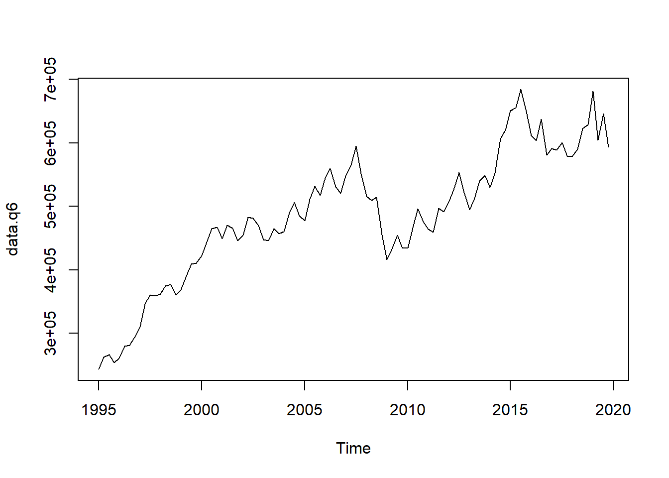 exports.q <- ts(exports.q$values, start = c(1995,1), end = c(2019, 4), frequency = 4)